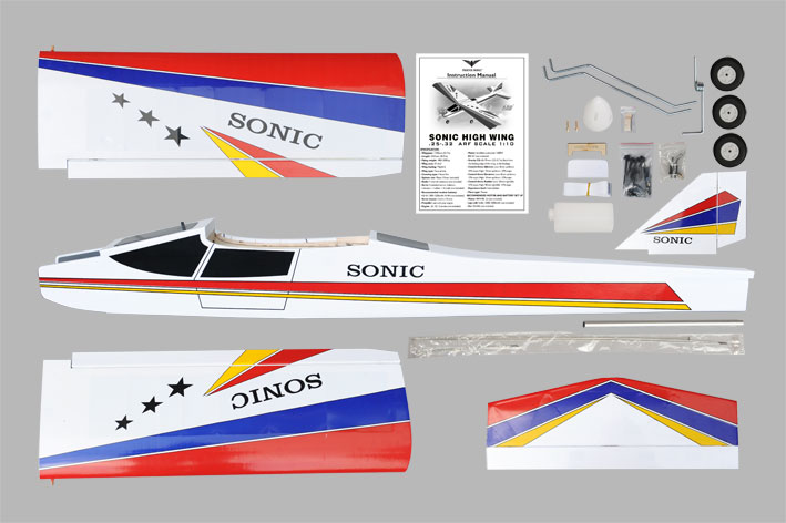 A asa alta Sonic oferece manobrabilidade semi-simétrica, tornando-se o treinador de mais alta qualidade, mais fácil de iniciar e mais fácil de voar em sua classe. A asa alta Sonic é habilmente feita à mão com balsa e compensado usando apenas colas epóxi e CA. Você pode pilotar este avião após 1-2 horas de instalação. Todo o hardware está incluído (fio servo, tanque de combustível, roda/equipamento de pouso, etc.). Você só precisa comprar separadamente o motor nitro e o sistema de rádio.